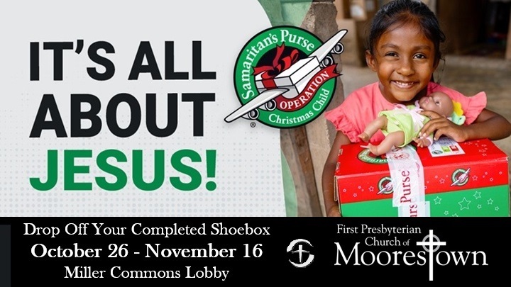 Be sure to read the instructions included in each box! Return your box by Sunday, November 16. Kindly include a check for $10 for shipping (you may also pay for shipping online). Let’s make a lasting impact, one box at a time. For questions or information, please contact Mark Budka at missions@fpcmoorestown.org .