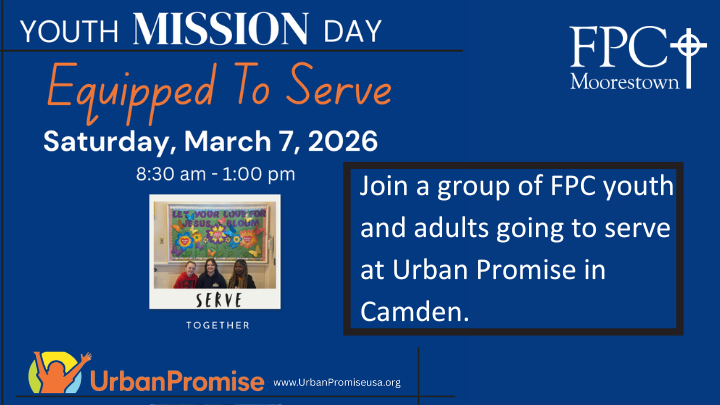 Join a group of youth (7th grade +) and adults from FPC Moorestown for a Mission Day on Saturday, March 7. Meet in the church parking lot at 7:45 am to carpool to UrbanPromise Camden.